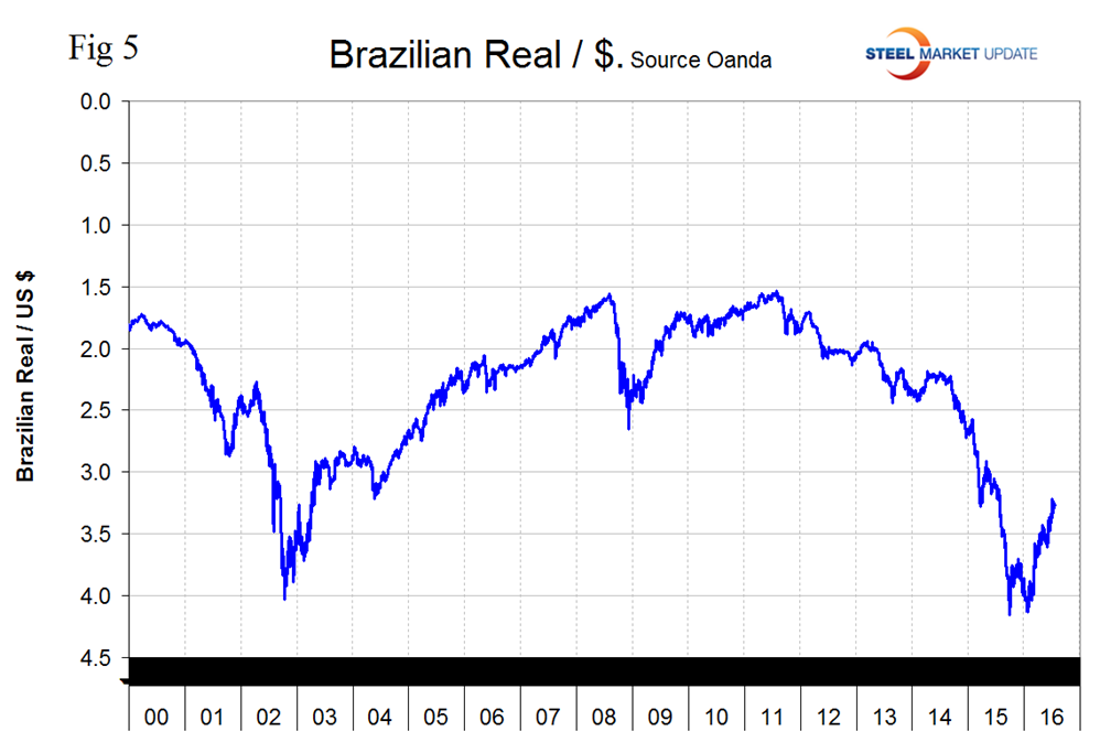 The Brazilian Real has also been on a tear this year, up by 26.45 percent from 4.1315 on January 22nd to 3.06 on July 18th (Figure 5).