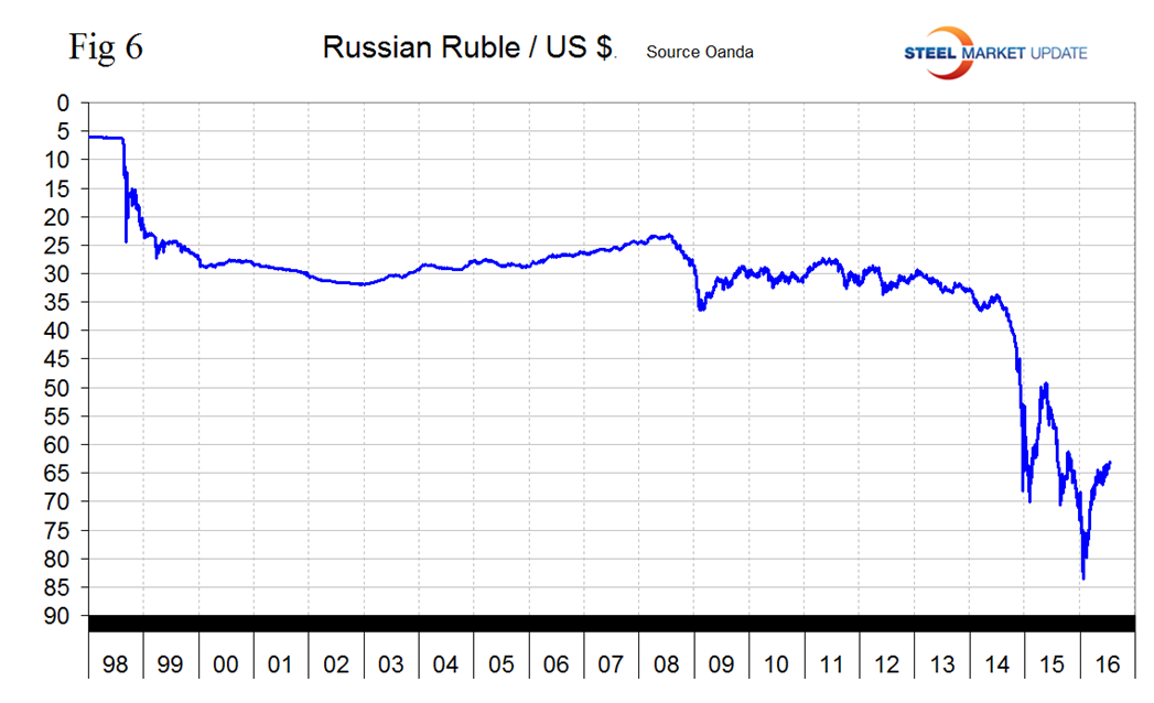 Figure 6 shows the history of the Ruble against the US $ since January 1998. The Ruble has appreciated by 32 percent from 83.67 on January 21st to 62.98 on July 18th. This has made up all its losses since last August.