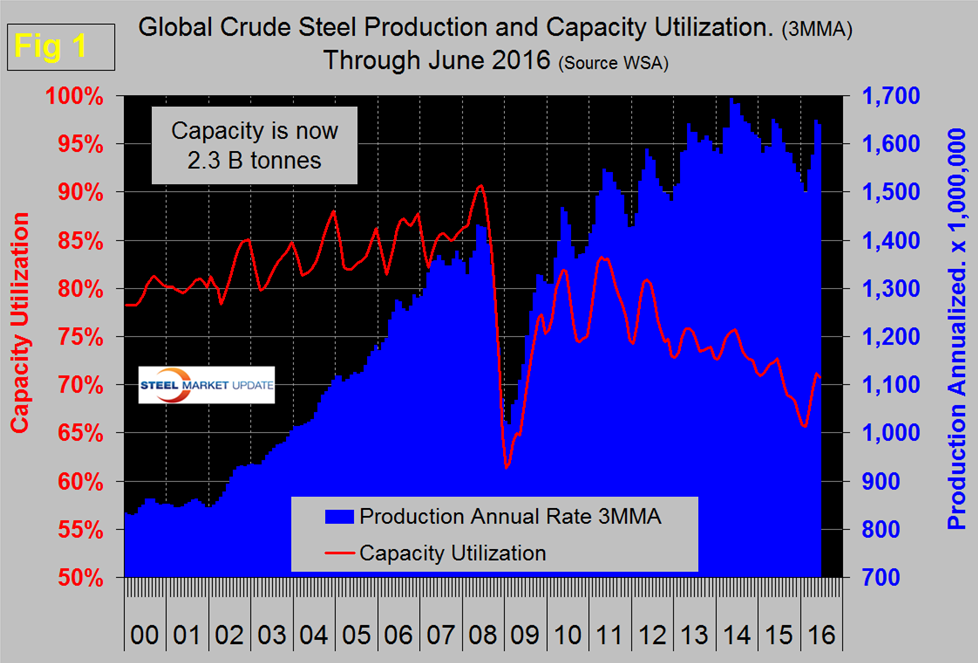 Production in the month of June at 135,720,000 metric tons was down by 2.7 percent from May and the three month moving average (3MMA) that we prefer as a measure was down by 0.2 percent year over year. Month over month the 3MMA was down by 0.6 percent. Capacity is 2.3 billion tonnes per year and the 3MMA of capacity utilization in June was 70.7 percent. Figure 1 shows monthly production and capacity utilization since January 2000.