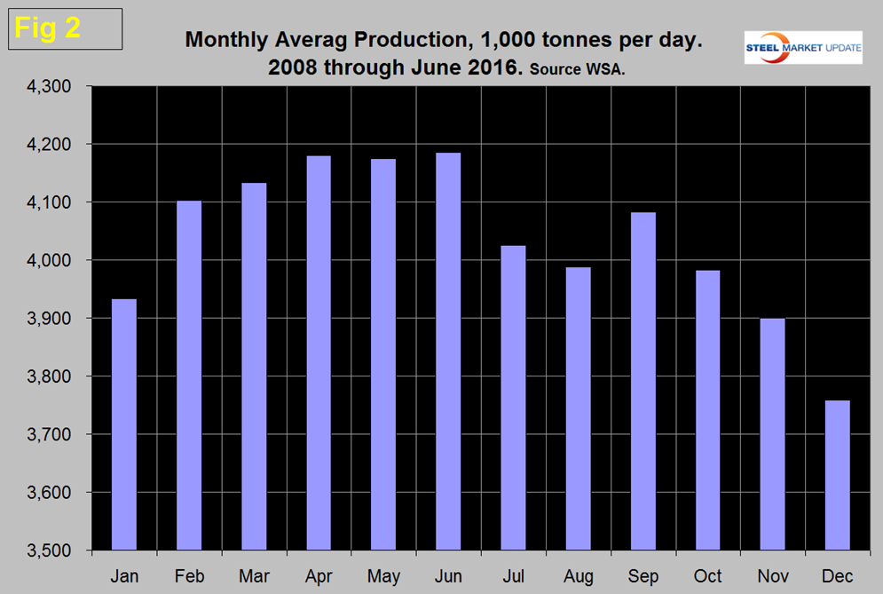 First we should look at seasonality. Global production has peaked in the summer for the last seven years including 2016. Figure 2 shows the average monthly production by month since 2008.