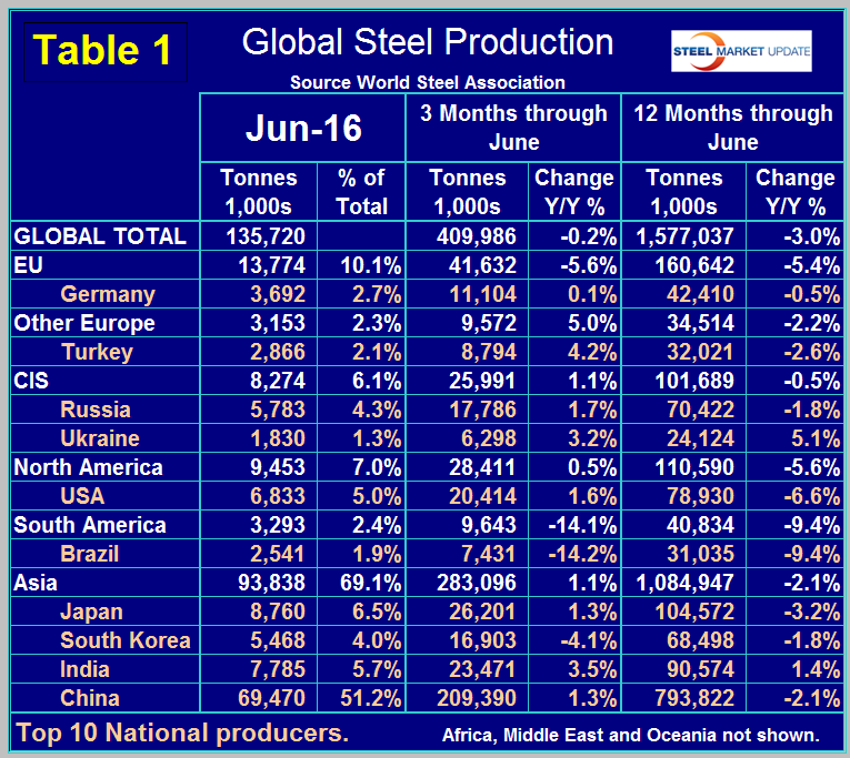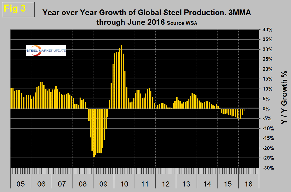 SMU Comment: Evidently China is picking up the pace again as the rest of the world has contracted for 17 straight months. With a global capacity utilization of less than 70 percent in June it is evident that capacity reductions have a long way to go before they begin to reduce the market pressure of over production. We repeat what we have said for the last two months and still believe, that oversupply and low capacity utilization won’t be resolved before the end of this decade.