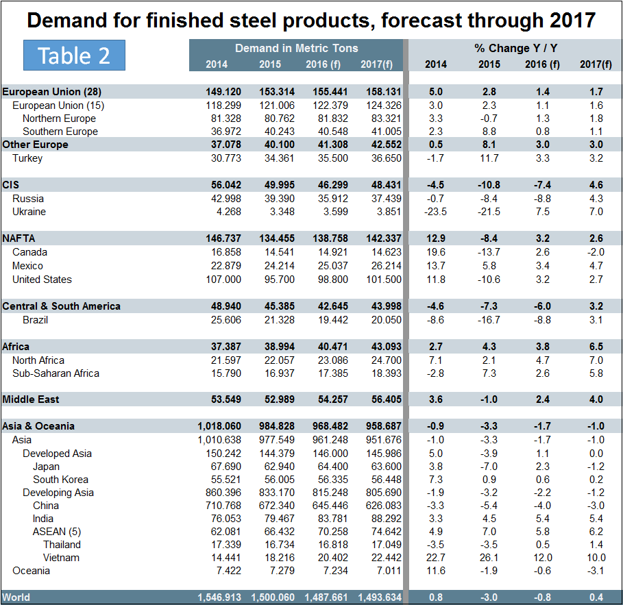 The October 2015 version of the World Steel Association Short Range Outlook (SRO) for apparent steel consumption in 2015 and 2016 had last year contracting at 1.7 percent and 2016 growing at 0.7 percent. What actually happened was that consumption contracted by 3.2 percent in 2015. In April this year the WSA updated its forecast. (Note this forecast is steel consumption, not crude steel production which is the main thrust of what you are reading now.) Figure 4 is a geographical view of production and growth in 2016 followed by Table 2 which shows the expectations by country and region. We will leave these two figures in our monthly updates for reference until they are revised in October.