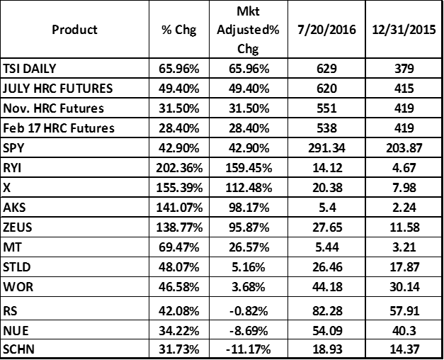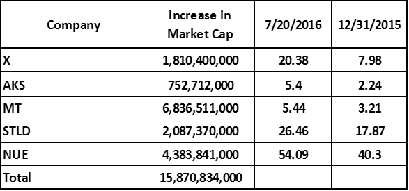 The five domestic publicly traded steel mills have seen their market capitalization increase by almost $16 BILLION dollars in 2016. How much leverage does this provide the mills with, to forego tons to keep prices at current levels?