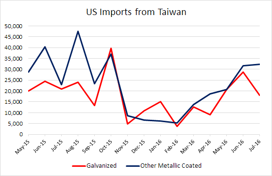 “The Taiwanese have been exporting coated products to the US for many years. They have a strong customer base, mainly end users and focus on added value products. The increase duty is not much of a deterrent. They get a higher price than the competition: $782/mt average CFR US ports in June for HDG as opposed to $515 for Vietnam. They have been increasing their exports to the US: 40,000mt in May, 60,000/mt in July ( HDG + Galvalume + PPGI). There is no reason for them to slow down. They do not compete with Vietnam or other new comers.”
