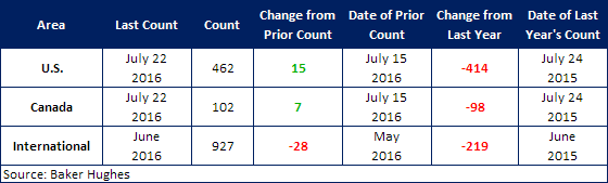 According to Baker Hughes data from July 22, 2016, the U.S rig count for the week was 462 rigs exploring for or developing oil or natural gas. This is up 15 rigs compared to last week, with oil rigs up 14 to 371 rigs, gas rigs down 1 to 88 rigs, and miscellaneous rigs up 2 to 3 rigs. Compared to this time last year, the 462 count is down 414 rigs, with oil rigs down 288, gas rigs down 128, and miscellaneous rigs up 2.