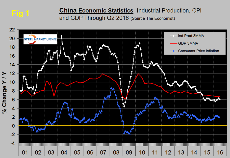 Figure 1 shows published data for the growth of GDP, industrial production and consumer prices through the second quarter of 2016. The GDP and industrial production portions of this graph are three month moving averages. The growth of GDP was 6.7 percent in the second quarter, which was unchanged from the first quarter, down from 6.8 percent in the fourth quarter of 2015, and the slowest pace since the global financial crisis. The growth rate of GDP has declined steadily since it peaked at 11.9 percent in Q1 2010.