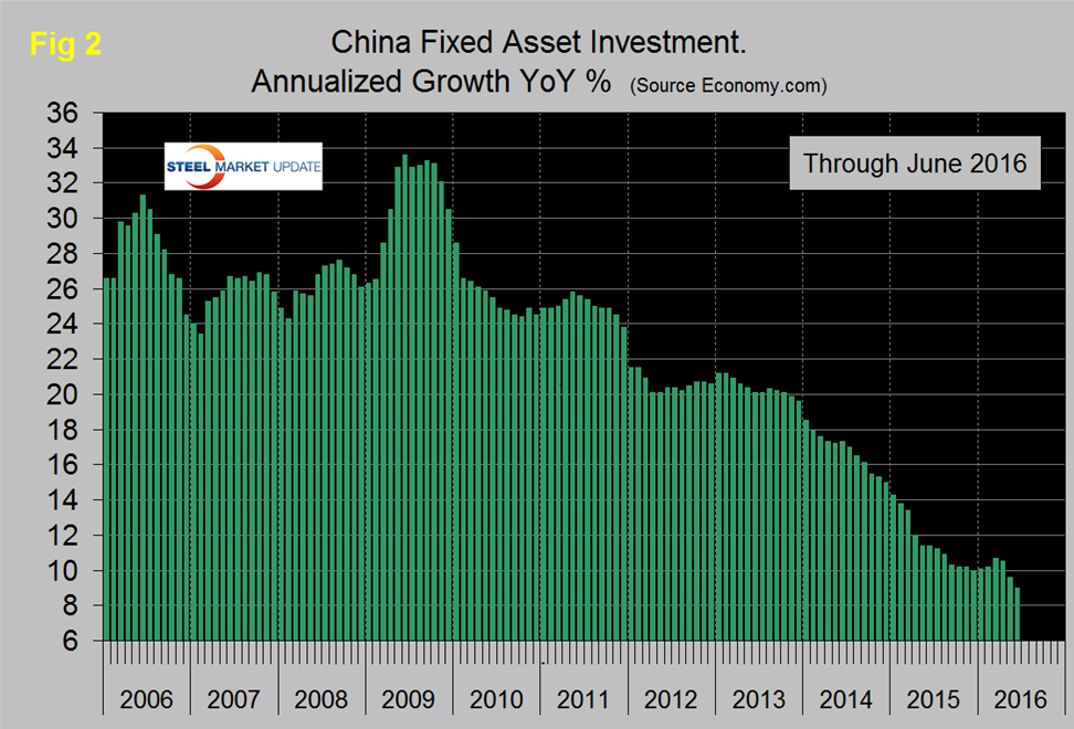 The growth slowdown experienced in 2013 accelerated through all of 2014 through August of 2015. Then the rate of growth slowed, picked up slightly in March and April this year before resuming a slower rate in May and June. In June FAI grew at 9.0 percent y/y which means it is still doubling every 96 months. The lower growth rate is being propped up by public investment as private investment dwindles. Overcapacity in heavy industry is dragging on investment growth, with mining-related investment falling steadily. We understand that this data includes real-estate purchases so is not a direct reflection of constructional steel demand. We are assuming that the steel consumption portion of this investment follows the overall trend and that the contraction in FAI is in accordance with the stated objective to rebalance the economy in favor of consumer consumption. Weaker investment in fixed assets is contributing to slower demand across a number of industries including steel and is pressuring corporate profits.