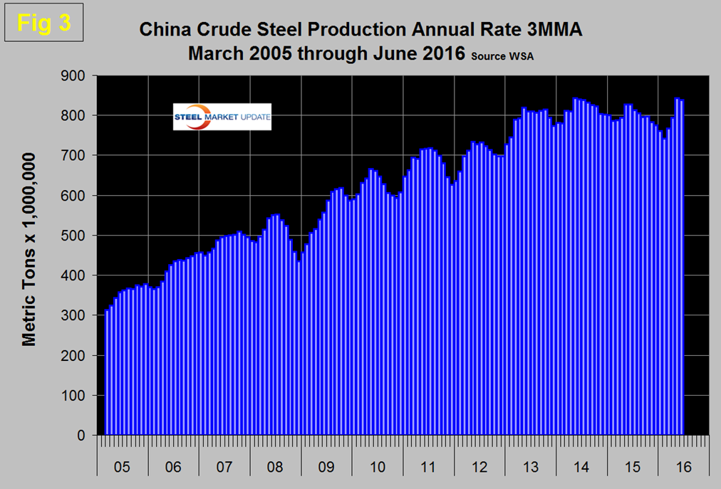 Figure 3 shows the 3MMA of China’s crude steel production since March 2005.