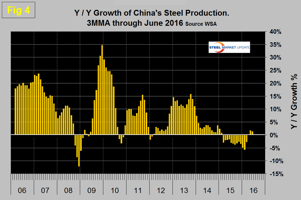From June 2015 through February this year there was a continuous decline, part of which was seasonal. Then production picked back up and in May and June there was positive year/year growth. Not something that any executive in the rest of the world steel industries wanted to see! Another way of looking at the change in growth is shown in Figure 4. The May and June result follows 13 consecutive months of y/y contraction and zero growth in April.