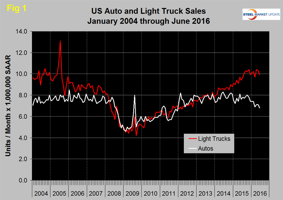 Light vehicle (LV) sales in June were 16.7 million units, down from 17.4 million in May and from 17.0 million in June last year. All sales numbers in this analysis are at a seasonally adjusted annual rate. Figure 1 shows the auto and light truck components since January 2004.