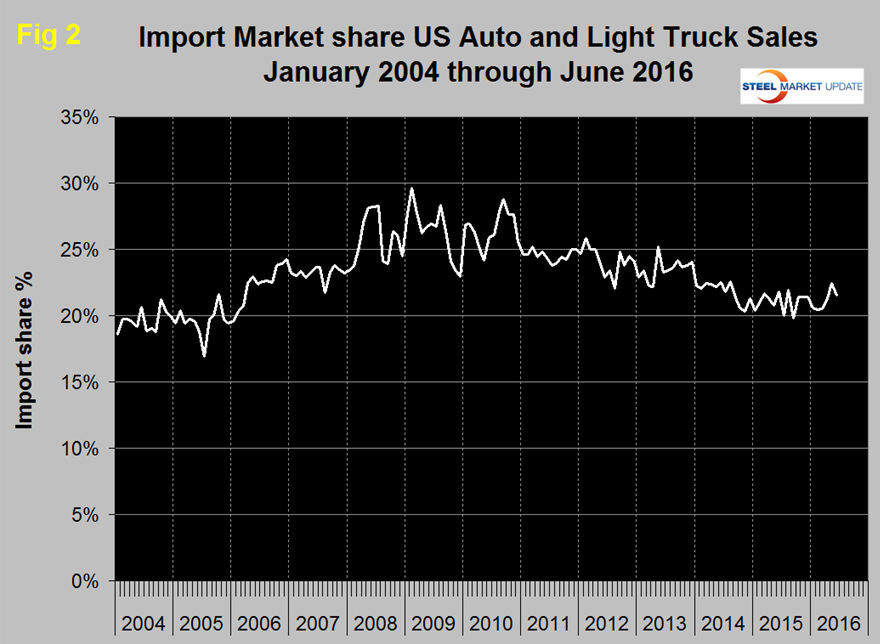 In June auto sales were 6.8 million units down from 7.1 million in May as light trucks declined from 10.3 million to 9.9 million. The mix was 59.3 percent light trucks which includes crossovers and 40.7 percent autos. In the last three months the percentage of light trucks in the mix has been >59 percent for the first time since the summer of 2005. All the major suppliers, except Land Rover and Volvo, experienced sales declines in June. GM was down by 2.0 percent, FCA was down by 10.7 percent and Ford was down by 6.2 percent. Economy.com believes that based on fundamentals, light vehicle sales should be about 16.5 million units. The June data brings light vehicle sales closer to that number. Through the end of the year, sales will likely continue in a downward direction. However, accommodative interest rates and rising incomes will help to cushion the blow as vehicle demand moves back to being driven by fundamentals, rather than pent-up demand. Import market share in June was 21.6 percent, down from 22.4 percent in May (Figure 2).