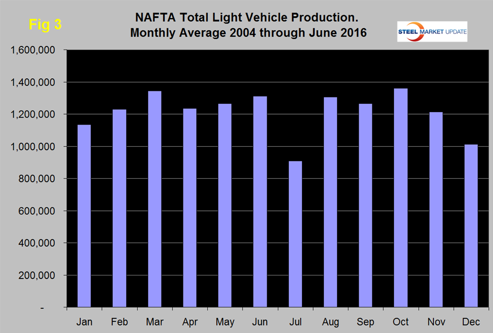 Total light vehicle production in NAFTA in June was at an annual rate (not seasonally adjusted) of 19.565 million, up from 17.486 in May and an all-time high. Total production in 2015 was 17.36 million units and in the first six months of this year was 18.1 million units annualized. In cases where seasonality is more than a weather effect we like to compare the monthly result with the monthly norm over a number of years. On average since 2004, June’s production has been 3.5 percent higher than May but this year production was up by 11.9 percent (Figure 3).