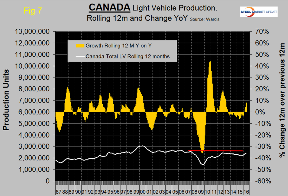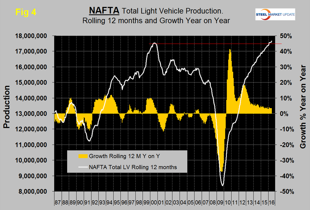 On a rolling 12 months basis y/y through June, LV production in NAFTA increased by 3.4 percent which was the same as 12 months through May and is consistent with the growth experienced in the last 12 months as indicated by the brown bars in Figure 4.