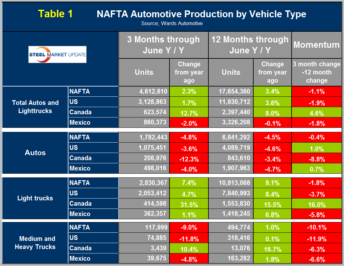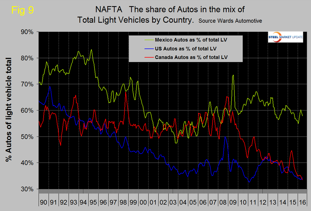 The percentage of autos in the production mix of all three countries has been declining, driven by consumer buying preferences which in turn are heavily influenced by gas prices. The change in preference for light trucks tends to favor the US and Canada over Mexico because the mix of light vehicles is so different by country. The percentage of autos in the Mexican mix in the last three months was 57.9 percent but only 34.4 in the US and 33.5 percent in Canada. This means that Mexico has staked out a higher relative capacity in autos which will serve it well when gas prices eventually rebound.