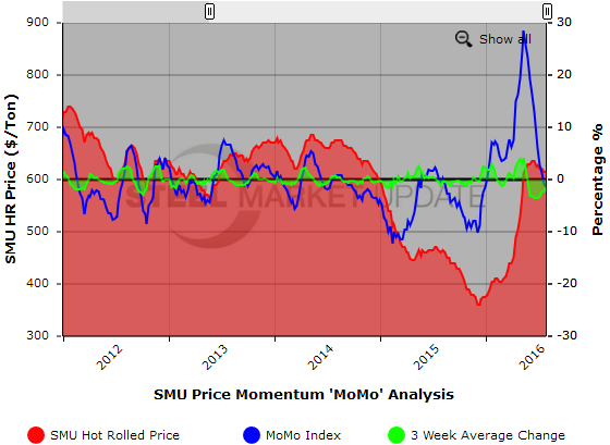 The Steel Market Update (SMU) Price Momentum Index (MoMo) for hot rolled steel in the United States remained negative this week for the second week in a row, following a 28 week long positive streak. MoMo is a trailing indicator and shows the relationship between the current U.S. hot rolled coil price movements against the previous 12-week average price as a percentage. A positive MoMo index indicates hot rolled steel prices are moving in an upward direction compared to the previous 12 week period, while a negative index number indicates a downward direction in prices.