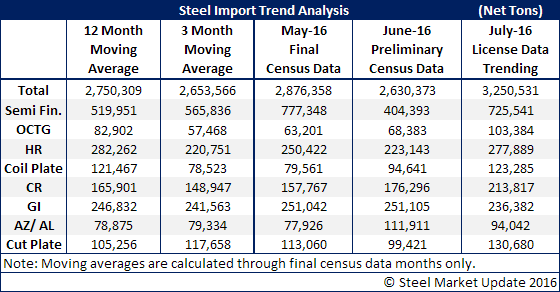 On Wednesday of this week the U.S. Department of Commerce reported Preliminary Census data on imports of foreign steel for the month of June 2016. The data is initially released in metric tons which Steel Market Update has converted to net tons for our readers. Imports in June totaled 2.630,373 net tons which are down from the 2,876,358 net tons received in May.
