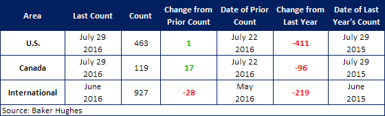 According to Baker Hughes data from July 29, 2016, the U.S rig count for the week was 463 rigs exploring for or developing oil or natural gas. This is up 1 rig compared to last week, with oil rigs up 3 to 374 rigs, gas rigs down 2 to 86 rigs, and miscellaneous rigs unchanged at 3 rigs. Compared to this time last year, the 463 count is down 411 rigs, with oil rigs down 290, gas rigs down 123, and miscellaneous rigs up 2.