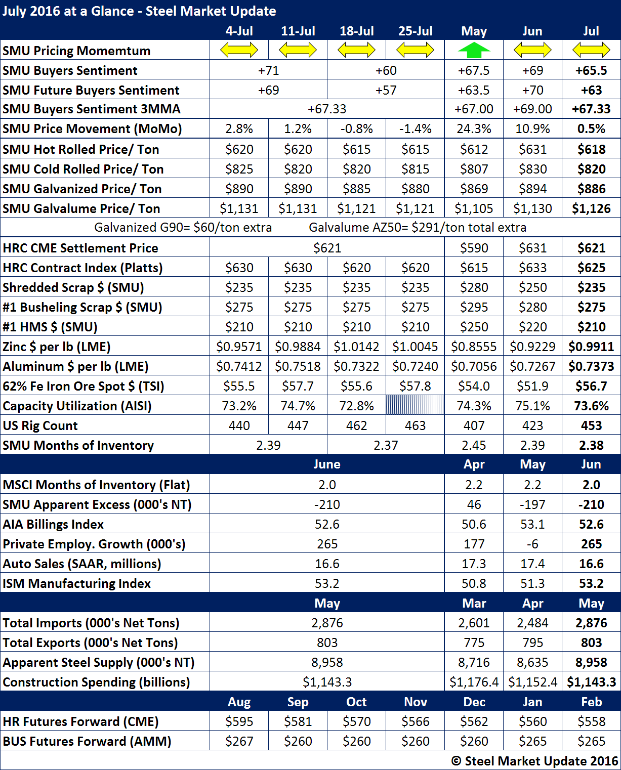 For the second month, SMU Price Momentum is at Neutral suggesting flat rolled steel prices will remain within a relatively tight trading range of plus or minus twenty dollars per ton over the next 30 days. We saw hot rolled prices only move $5 per ton during the month of July. Our average for the month came in at $618 per ton while the CME settlement number for the month was three dollars higher at $621 per ton. Platts was also higher averaging $625 per ton for the month.