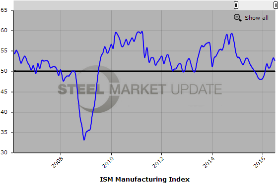 Below is a graph showing the history of the ISM index. You will need to view the graph on our website to use it’s interactive features, you can do so by clicking here. If you need assistance with either logging in or navigating the website, please contact our office at 800-432-3475 or info@SteelMarketUpdate.com.