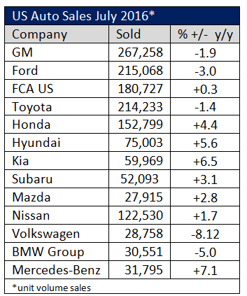 Auto sale volume for July was mixed, with the largest manufacturers slipping in volume year-over-year and most of the smaller ones gaining by single digit percent but still below analyst estimates. FCA US picked up just 0.3 percent over July 2015, while GM sales dipped 1.9 percent, Ford dropped 3 percent, and Toyota sales decreased 1.4 percent.