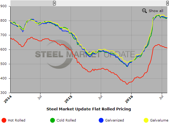 SMU Note: Below is a graphic showing our hot rolled, cold rolled, galvanized, and Galvalume price history. To use the graphs interactive capabilities, you must view it on our website here. If you need help navigating the website or need to know your login information, contact us at info@SteelMarketUpdate.com or by calling 800-432-3475.