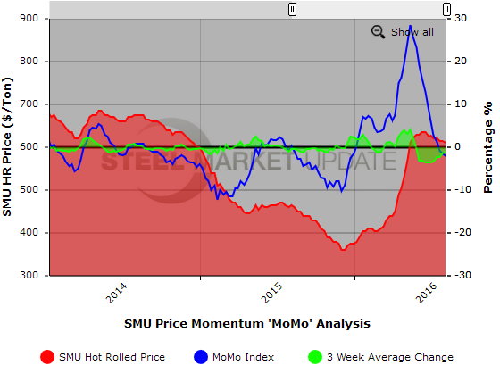 The graph below demonstrates the relationship between the SMU hot rolled coil price, the SMU Price MoMo Index, and the three week moving average change in the MoMo Index. Click here to view and interact with it on our website. As published in our Tuesday evening issue, the SMU HRC price range for this week is $590-$630 per ton with an average price of $610, down $5 from last week.