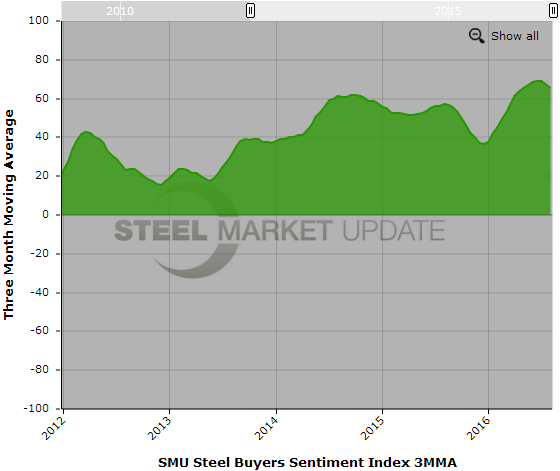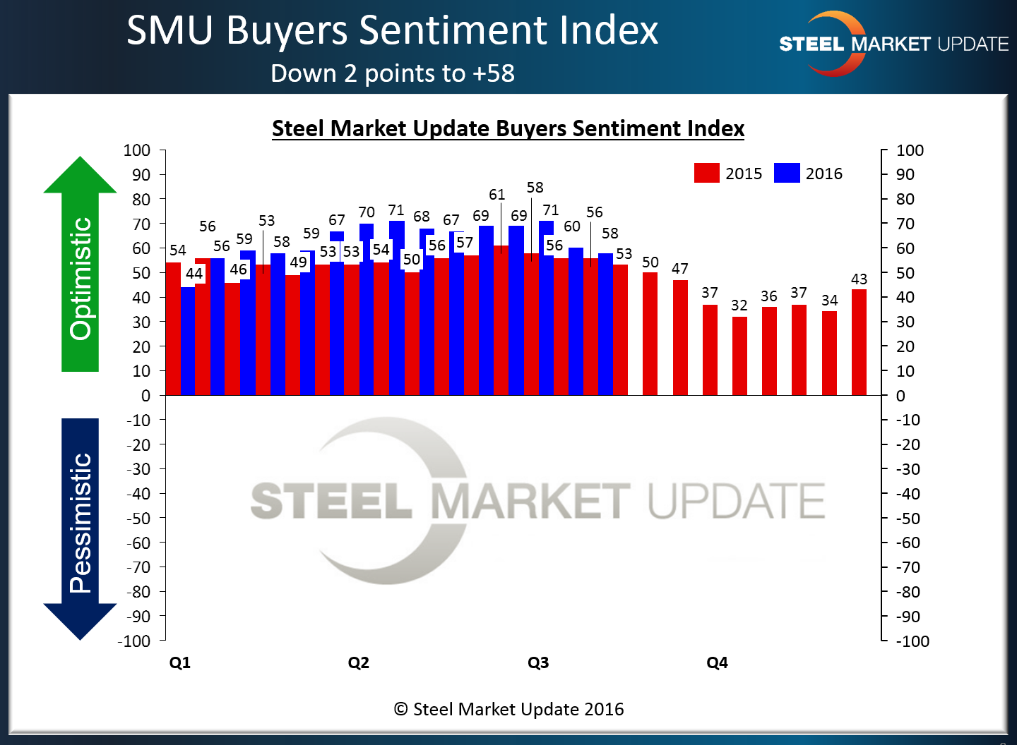 Unbridled optimism is becoming slightly tarnished as the SMU Steel Buyers Sentiment Index dropped to +58, down 2 points from the middle of July and down 13 points from one month ago when Sentiment set a record high of +71.