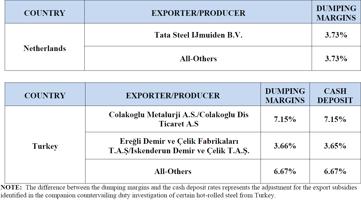 In the Turkey AD investigation, Commerce found that dumping has occurred by mandatory respondents Colakoglu Metalurji A.S./Colakoglu Dis Ticaret A.S and Ereğli Demir ve Çelik Fabrikaları T.A.Ş./Iskendrun Demir ve Çelik T.A.Ş. at dumping margins of 7.15 percent and 3.66 percent, respectively. Commerce calculated a final dumping margin of 6.67 percent for all other producers/exporters in Turkey.
