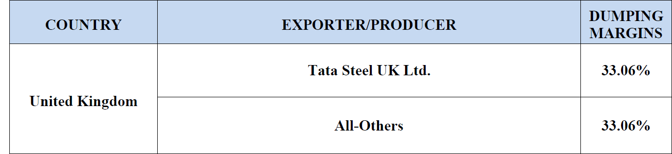 In the United Kingdom AD investigation, Commerce found that dumping has occurred by mandatory respondent Tata Steel UK Ltd. at a dumping margin of 33.06 percent. Commerce calculated a final dumping margin of 33.06 percent for all other producers/exporters in the United Kingdom.