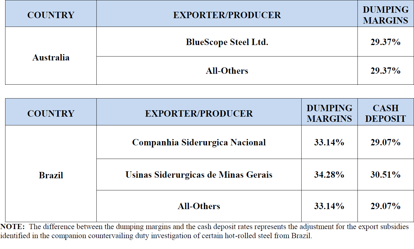 In the Australia investigation, Commerce found that dumping has occurred by mandatory respondent BlueScope Steel Ltd. at a dumping margin of 29.37 percent. Commerce calculated a final dumping margin of 29.37 percent for all other producers/exporters in Australia.