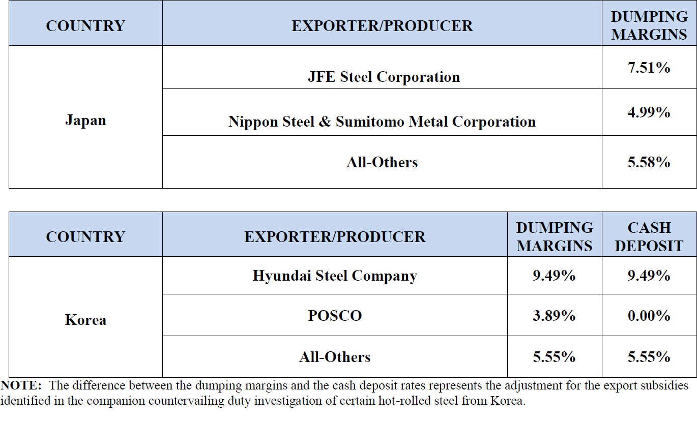 In the Korea AD investigation, Commerce found that dumping has occurred by mandatory respondents Hyundai Steel Company and POSCO at dumping margins of 9.49 percent and 3.89 percent, respectively. Commerce calculated a final dumping margin of 5.55 percent for all other producers/exporters in Korea.