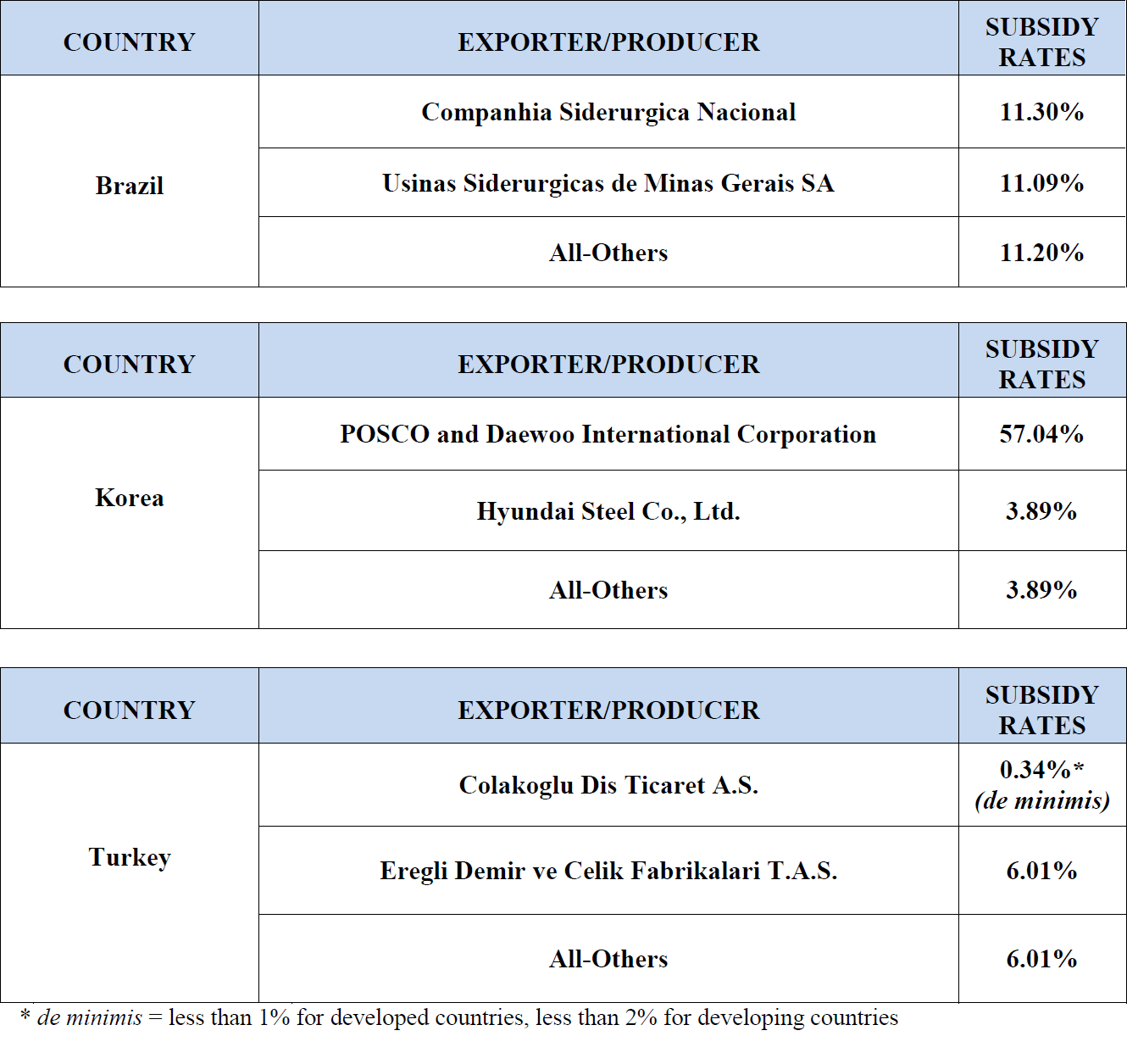 As a result of the affirmative final AD determinations , Commerce will instruct U.S. Customs and Border Protection (CBP) to collect cash deposits equal to the applicable weighted-average dumping margins. For the Korea and Turkey CVD investigations, which both had negative preliminary determinations and affirmative final determinations, Commerce will instruct CBP to collect cash deposits equal to the applicable subsidy rates effective on the date of publication of the final determinations in the Federal Register. Further, as a result of the affirmative final CVD determination in the Brazil investigation, if the U.S. International Trade Commission (ITC) issues affirmative injury determinations, Commerce will order the resumption of the suspension of liquidation and will require cash deposits for CVD duties equal to the final subsidy rates established during the investigation, except where these rates are zero or de minimis. Commerce will also adjust the AD cash deposit rates by the amount of the CVD export subsidies, where appropriate. If the ITC issues negative final injury determinations, the investigations will be terminated and no producers or exporters will be subject to future cash deposits for either AD or CVD duties. In such an event, all previously collected cash deposits will be refunded.