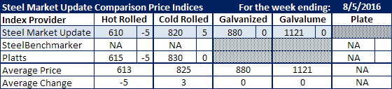 Cold rolled averaged $820 on the SMU index ($41.00/cwt) and $830 at Platts ($41.50/cwt). The Platts number was the same as the prior week while the SMU cold rolled average was up $5 per ton.