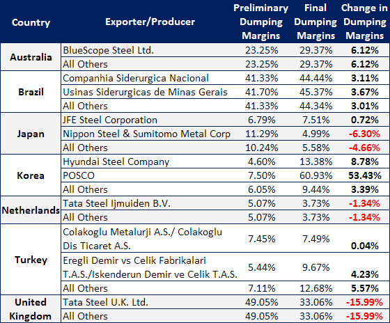 On Friday the U.S. Department of Commerce announced their final determination findings on hot rolled steel dumping margins and countervailing subsidy rates for Brazil, South Korea, Australia, Turkey, Japan, United Kingdom and the Netherlands. In the article above we reproduced the press release provided by the Commerce Department. In this article we are going to compare the preliminary determinations with the final and see if there are any surprises that could impact U.S. customers.