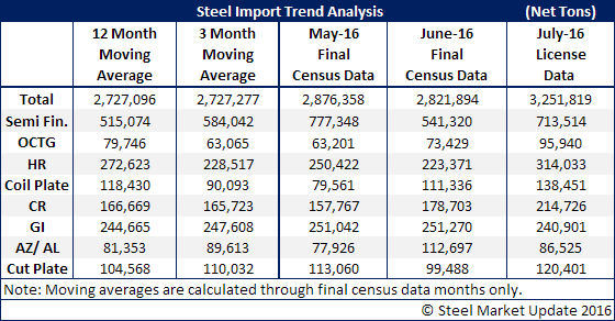 As you look at the data below you will notice that there is once again a large increase of imported semi-finished steels (slabs and billets but mostly slabs) during the month of July. Semi’s are only used by the domestic steel industry.