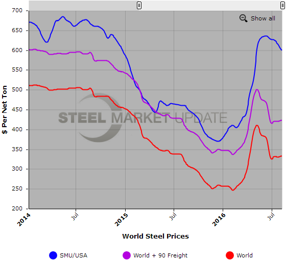The latest Steel Market Update hot rolled price average is $600 per ton for domestic steel, down $15 per ton compared to the last time we did an update on world prices and down $25 per ton over our mid-July price.This puts the theoretical spread between the European HR export price and the SMU HR price at $87 per ton, and the theoretical spread between the Chinese HR export price and the SMU HR price at $136 per ton.