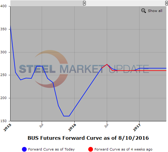 CFR Turkish scrap is holding steady at $229/MT due to robust demand. Higher Chinese Steel prices and Billet prices have kept this market well bid. Narrowing lead times for HR and tepid demand for scrap from mills saw BUS slip roughly $10 to $264 for August. Sep/Dec’16 traded $260/GT today. Market offers look to be coming in slighty in Q4’16. With Sep/Dec’16 bid today at 552.5 and Sep/Dec’16 sold in BUS the metal margin spread is running at roughly $292 which reflects a drop from $300 plus.