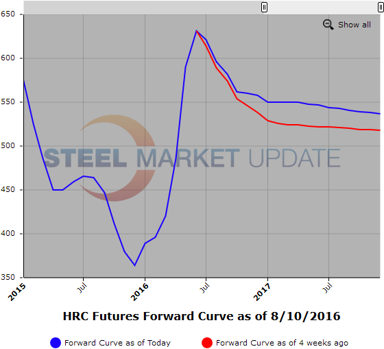 HR futures prices are down over $10/ST Sep’16/Dec’17 over the last week, roughly in line with the different indexes being reported. SMU reported HR down to $600 last. With the indexes continuing to drop, the futures are trading more briskly as sellers enter the market. The larger drop in the indexes appears to have given markets a strong enough signal to sell the curve. Activity has picked up with 23,500 ST trading in the last week. with the focus widening from Cal’17 to Sep’16,Q4’16,Q1’17, Q2/Q4’17, and Cal’17. Sep’16 traded at $582/ST on Tuesday and again today at $574/ST. Q4’16 traded @ $560 in 3,600 ST on both Friday and Monday. Q1’17 traded @ $547/ST average in 4,920 ST on Tuesday and today.