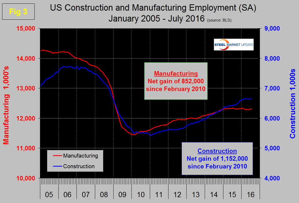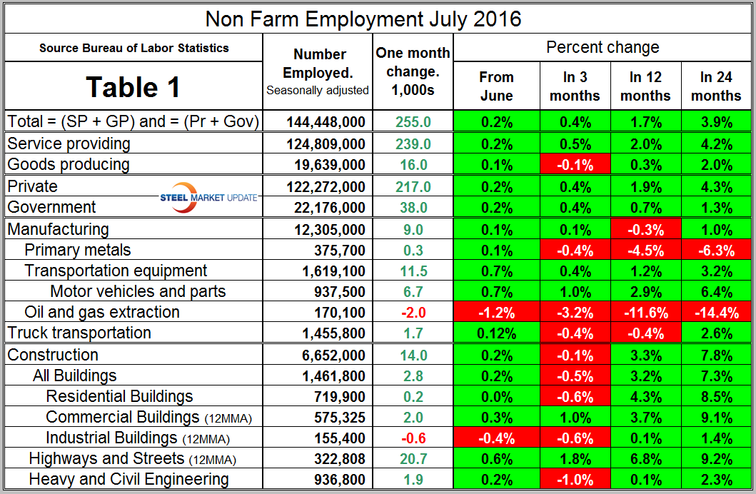 In July manufacturing gained 9,000 jobs but for the year as a whole is down by 15,000. On a positive note June and July were the first back to back months of manufacturing employment gains this year. In July total manufacturing employment was 0.3 percent less than a year ago but 1.0 percent higher than two years ago. Primary metals had positive job creation in July for the first time since June last year but is down by 8,000 ytd 2016. Table 1 shows that in July all the sectors of manufacturing that we identify were positive except for oil and gas extraction. Note the subcomponents of both manufacturing and construction shown in Table 1 don’t add up to the total because we have only included those that we think have most relevance to the steel industry.