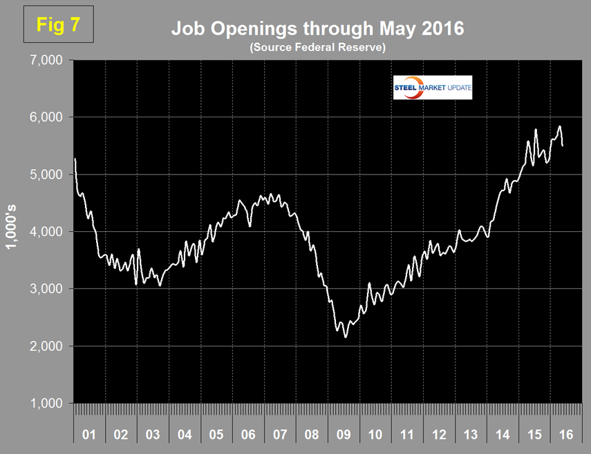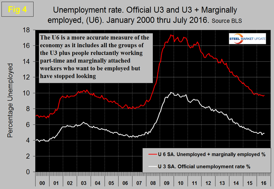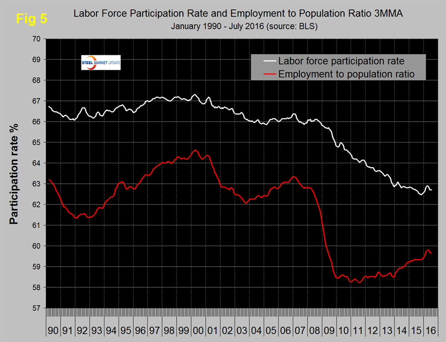The employment participation rate is widely quoted in the press as going nowhere. In July 2016 the rate was 62.8 percent, with a 3MMA of 62.7 percent down from 62.9 percent in April. We’re not sure that we understand what this is a percentage “of” because of the multiple descriptions of the labor pool. Another measure is the number employed as a percentage of the population which we think is much more definitive. In July this measure stood at 59.7 percent with a 3MMA also of 59.7 percent which was down from 59.8 percent in March through May. Figure 5 shows both measures on one graph.