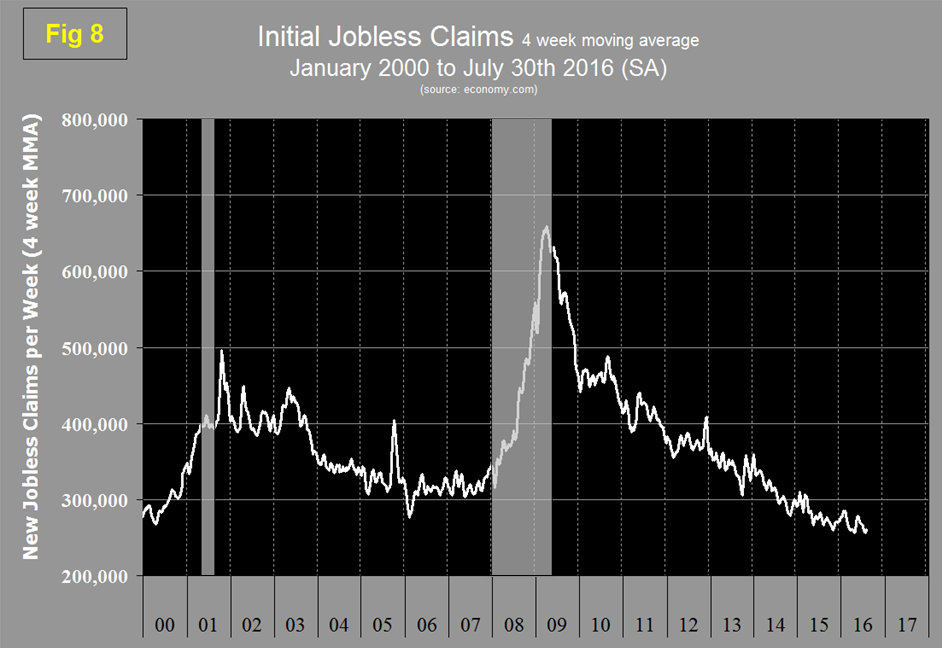 Initial claims for unemployment insurance, reported weekly by the Department of Labor (DOL) have continued their downward drift this year and in w/e July 30th were 260,250 on a four week moving average basis. The DOL stated, “There were no special factors impacting this week’s initial claims. This marks 74 consecutive weeks of initial claims below 300,000, the longest streak since 1973.” (Figure 8).