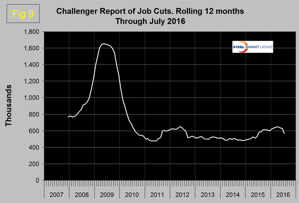 This data also tends to be quite erratic therefore again we examine a rolling 12 months and can see that job cuts increased from late 2014 through April this year, declined in May and June and dived in July.