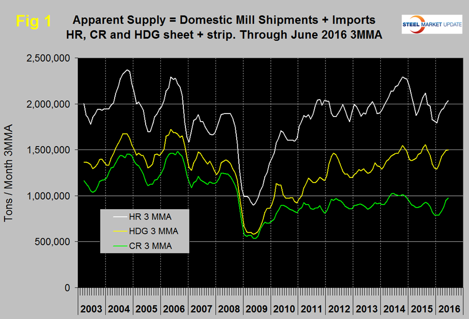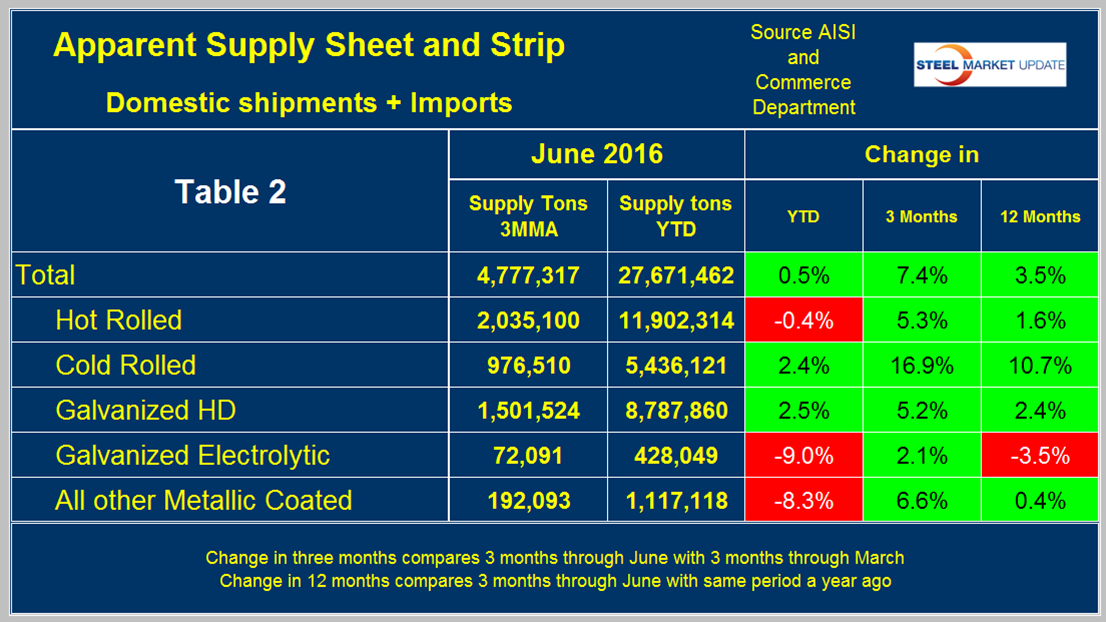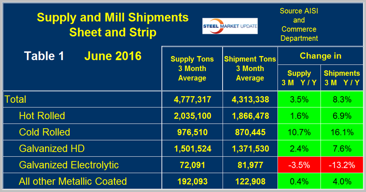 Table 1 shows both apparent supply and mill shipments of sheet products (shipments includes exports) side by side as a three month average through June, for both 2015 and 2016.