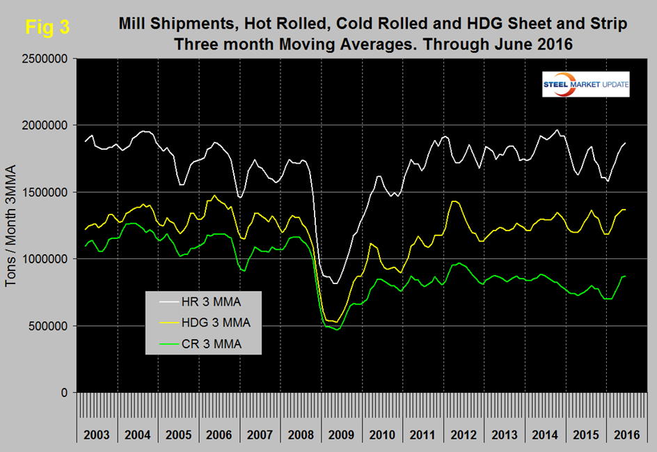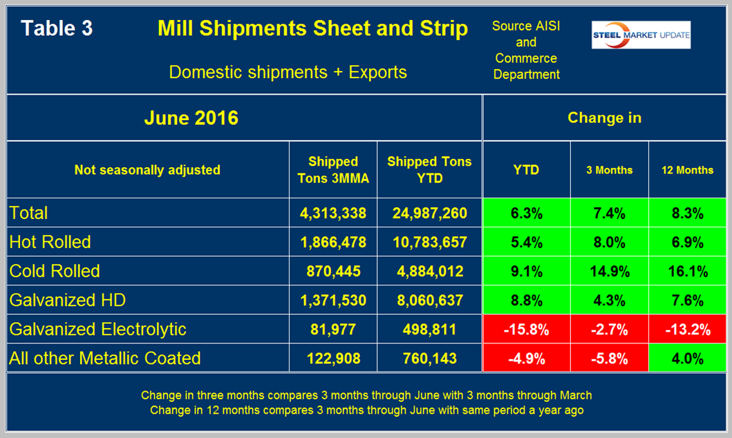 Table 3 shows that total shipments of sheet and strip products including hot rolled, cold rolled and all coated products were up by 8.3 percent in 3 months through June year over year and up by 7.4 percent comparing three months through June with three months through March.