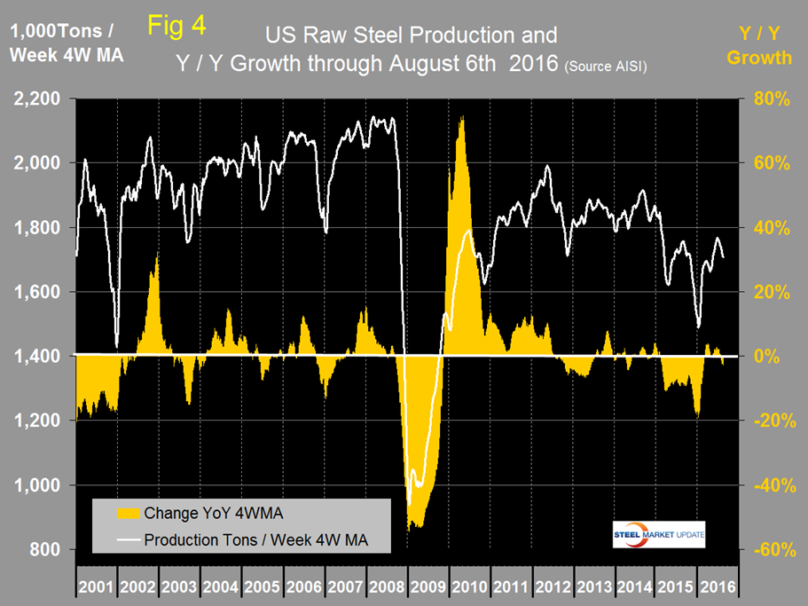 SMU Comment: The numbers in this report illustrate why it’s necessary to look at different time periods to try to understand the whole picture. We could draw different conclusions based on which time period we chose to describe. Shipments and supply are both still experiencing positive Y/Y growth but the growth of shipments is slowing as supply growth is accelerating. A problem with this data is that it’s now mid-August and the latest data we have for shipments and supply is for June. The AISI puts out weekly data for crude steel production the latest for which was w/e August 6th. This provides the most current data for steel mill activity. Figure 4 shows the Y/Y change in weekly crude output on a four week moving average basis.