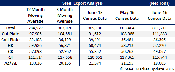 Exports to Canada were nearly unchanged month-to-month at 413,951 net tons, but were 7 percent lower than in June 2015. Exports to Mexico increased 3.7 percent from May but decreased 6.6 percent from the previous June to total 315,937 net tons, while exports to the European Union fell 13.5 percent from the preceding month to 21,833 net tons, 7.2 percent less than in June of last year.