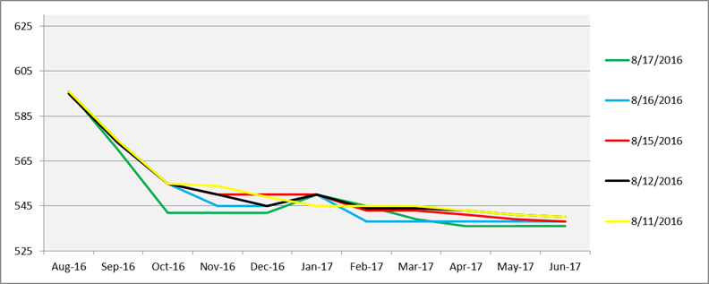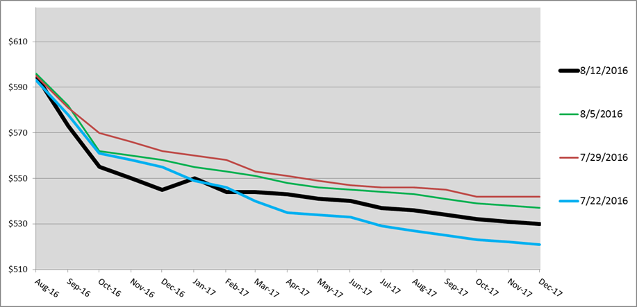 Looking back to mid-July, we can see that Q4 2016 and Q1 2017 are down about $20 in four weeks, but there has yet to be any major volatility. Also notice the curve has flattened somewhat. That being said, the curve is still far below current physical spot prices.