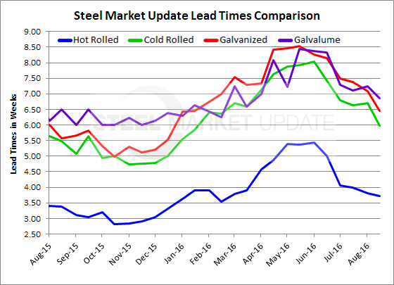 Galvanized lead times now average 5.45 weeks which is about one half a week less than the 7.08 weeks reported at the beginning of August. During the month of July GI lead times were closer to 7.5 weeks. One year ago GI lead times were essentially the same as what we are reporting for this week (5.48 weeks in 2015 vs. 5.45 weeks now).