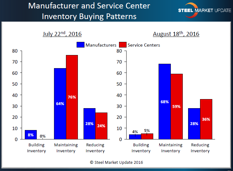 A question we have in our mind is why are lead times shrinking? Have buyers stopped buying (and does demand play a part if they have stopped buying or is it being caused by something else)? One way we get an indication of whether buyers have stopped buying is to take a look at whether manufacturing companies and service centers are building, reducing or maintaining inventories. As you can see by the graphic below the vast majority are maintaining inventories and there has been some growth in those who are reducing inventories (which stands to reason if prices are rolling over and starting to drop).