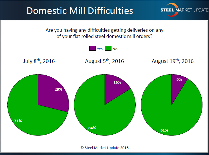 We discussed in our last issue the issue of lead times and negotiations. Another area we watch as a gauge of market direction is whether companies are having any difficulties getting deliveries out of their domestic mill suppliers. As you can see by the graphic below the percentage of late deliveries has shrunk from 29 percent in early July to 9 percent this past week.